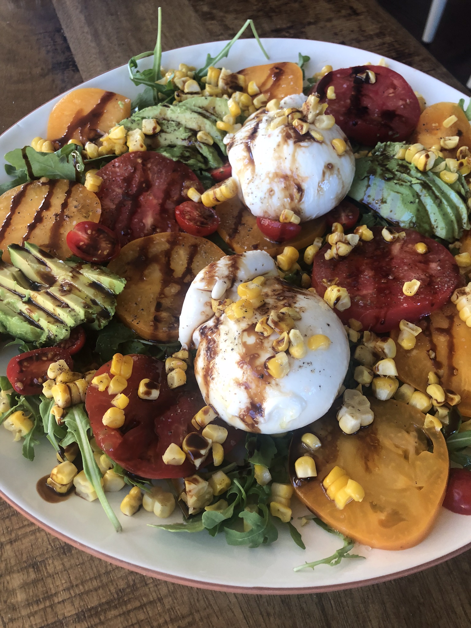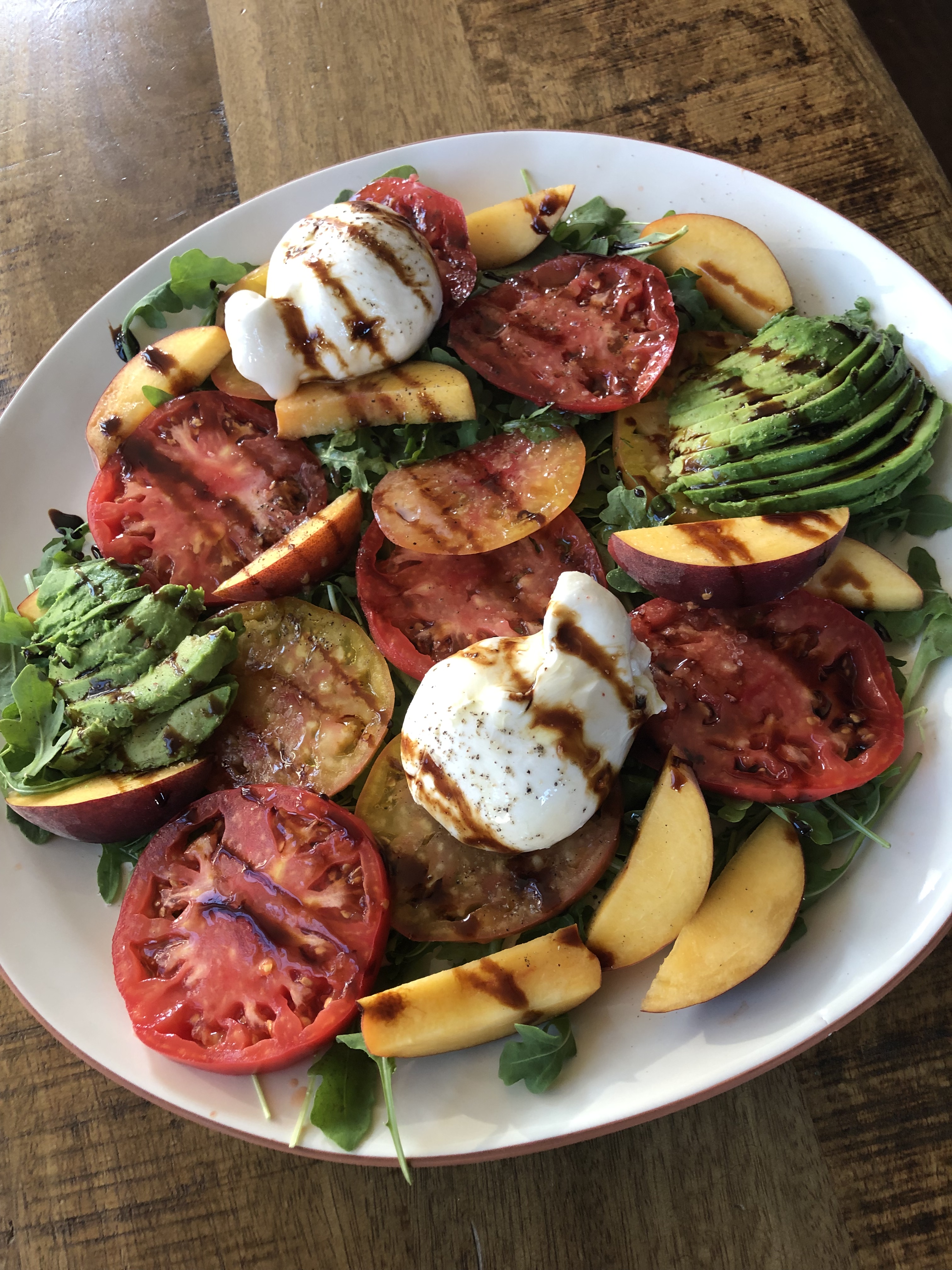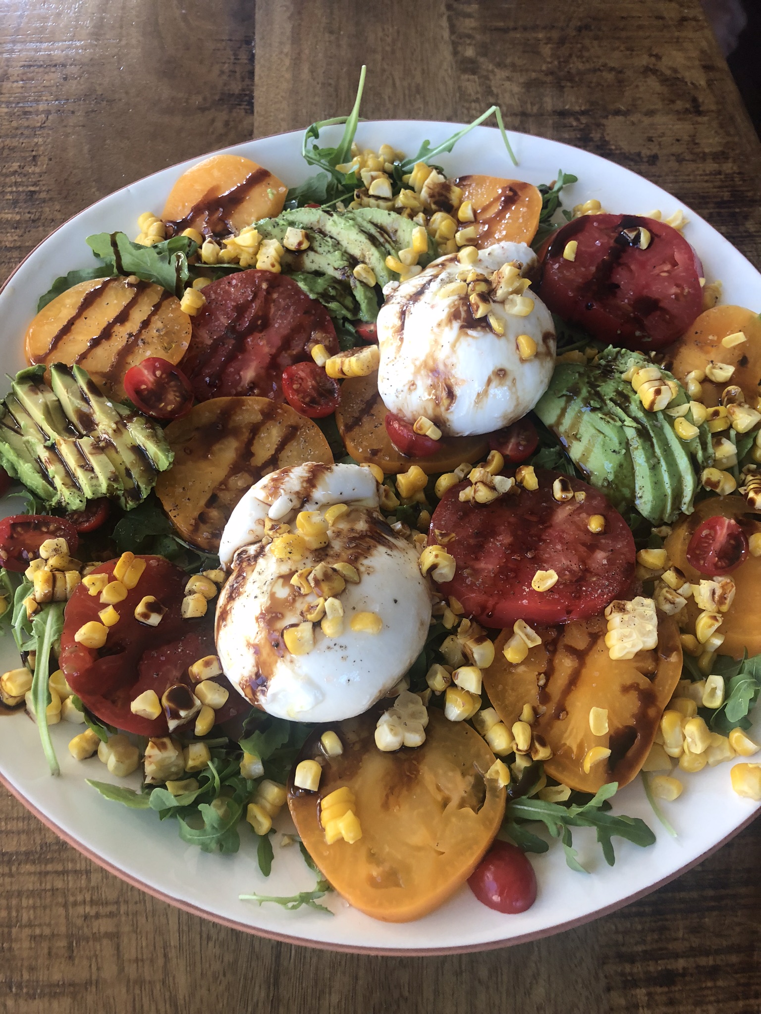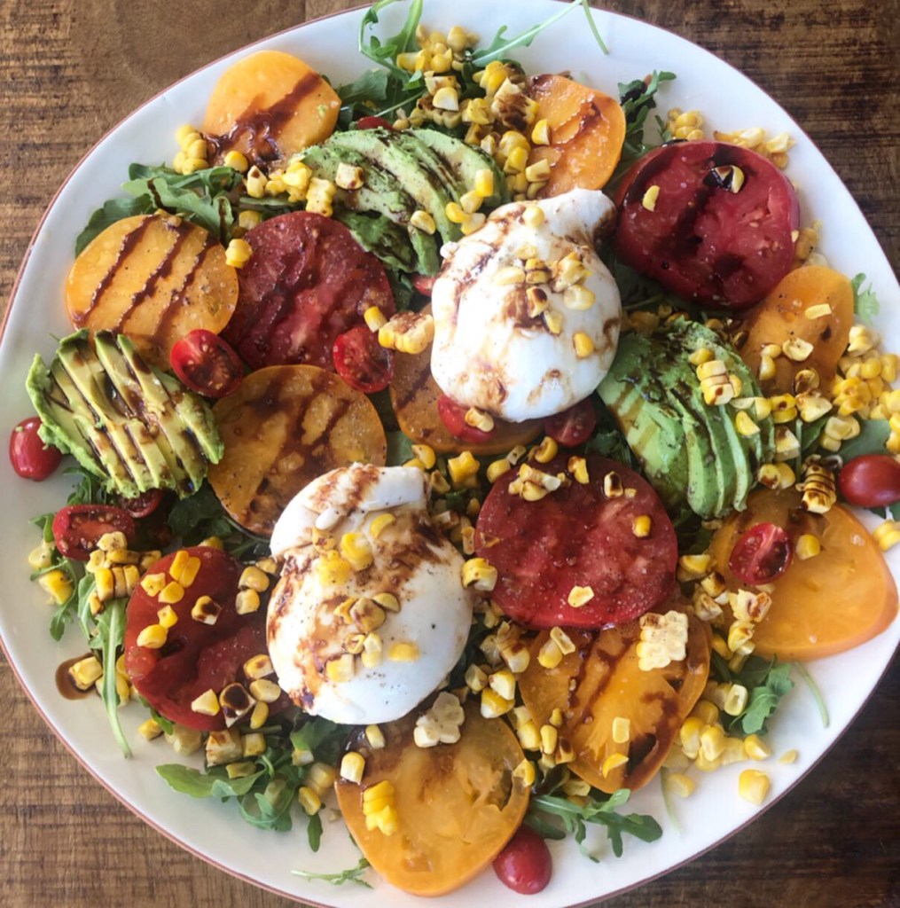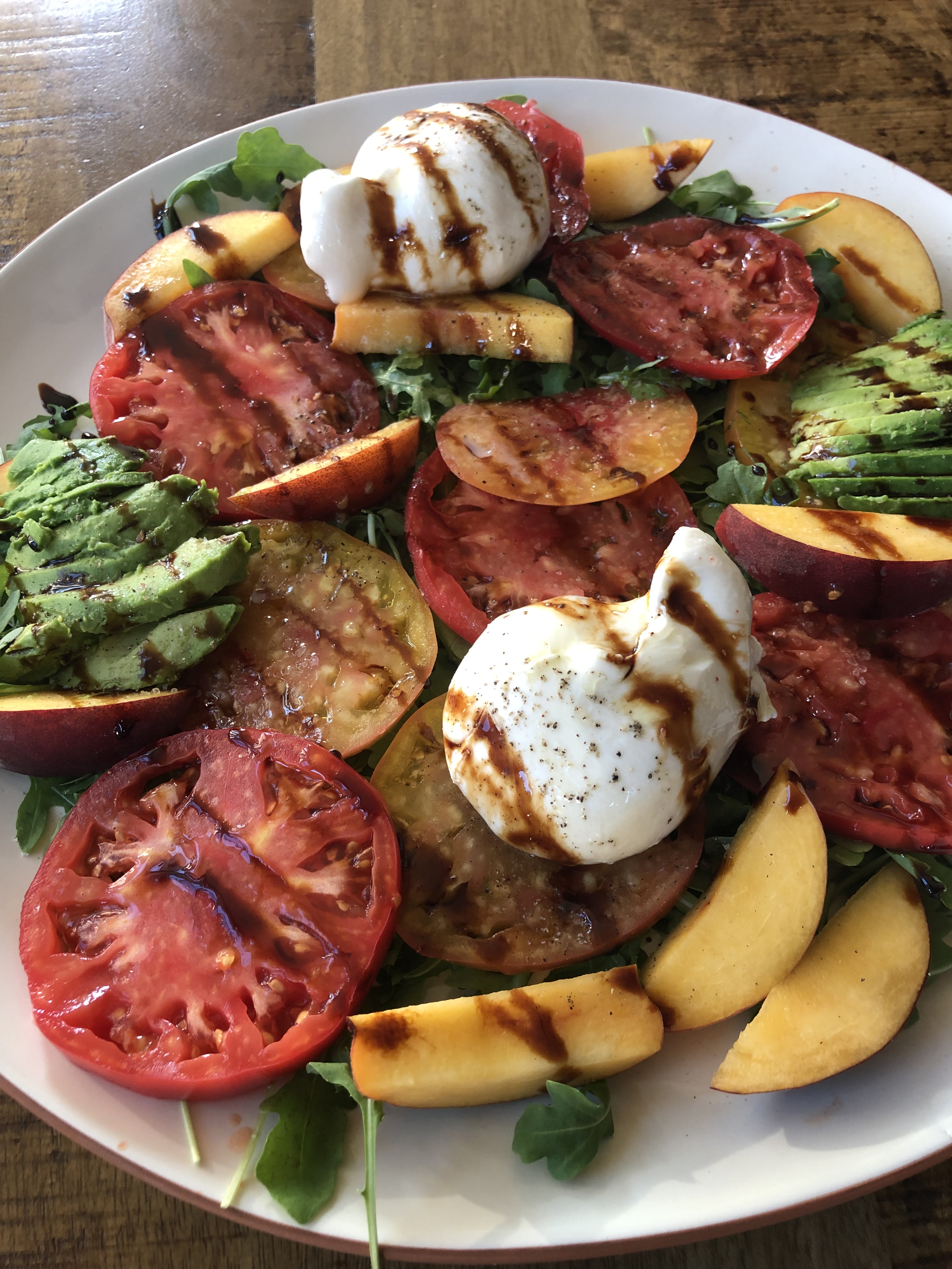 Find yourself a large platter or plate to assemble this goodness. Spread a good layer of greens to cover the platter. I chose arugula for both versions, but you could easily swap with anything you like – spinach, kale, swiss chard, etc. Then add a layer of sliced heirloom tomatoes. Or you could do sliced cherry or plum tomatoes, or romas, or whatever you have on hand. For one version of this salad I also chose to add some sliced peaches, which was a nice, sweet addition. Pile on some avocado and if you have some roasted sweet corn, that gives it a nice flavor and added texture. Top it off with some burrata cheese. Fresh mozzarella or goat cheese would also be great with this. And if you’re eating a vegan diet, you can skip the cheese or swap it out with your favorite non-dairy cheese. Finally, dress the salad! Sprinkle with salt and pepper. Drizzle with extra virgin olive oil and either balsamic reduction or balsamic vinegar. That’s it! Take it to the table and dig in!! I hope you enjoy whatever version of this salad you put together and I hope you also fully enjoy whatever season it is today. Rain or shine, we still gotta dine! AmIRight?! Love yas.